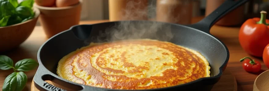 Le geste d’étalement varie également selon le poids et le diamètre de votre ustensile. Une poêle lourde en fonte exige un mouvement rotatif ample du poignet pour répartir la pâte avant qu’elle ne commence à prendre. Une poêle légère permet un étalement plus progressif avec des corrections en cours de cuisson. Le diamètre détermine la quantité de pâte : une louche rase pour 24 cm, une louche bombée pour 28 cm, une louche et demie pour 32 cm.